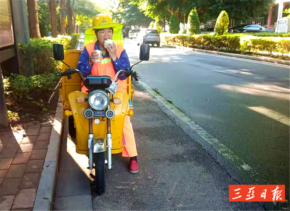 早上常常來不及在家里吃早餐,藍(lán)亞燕會帶著微燙的早餐來上班,等清理一段路后,才會吃上一口,而此時早餐往往已經(jīng)涼了。如果累了,要么席地而坐休息幾分鐘,要么在她的“敞篷車”上休息一會。