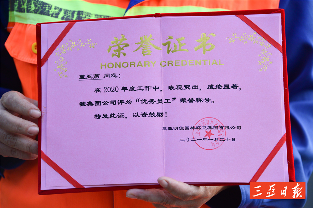 “亞燕是一個工作負(fù)責(zé)、認(rèn)真的員工,她工作讓我很放心,平時她還主動幫助其他工人,累活也搶著干?!泵骷循h(huán)衛(wèi)天涯一隊隊長林海菊這樣評價藍(lán)亞燕。